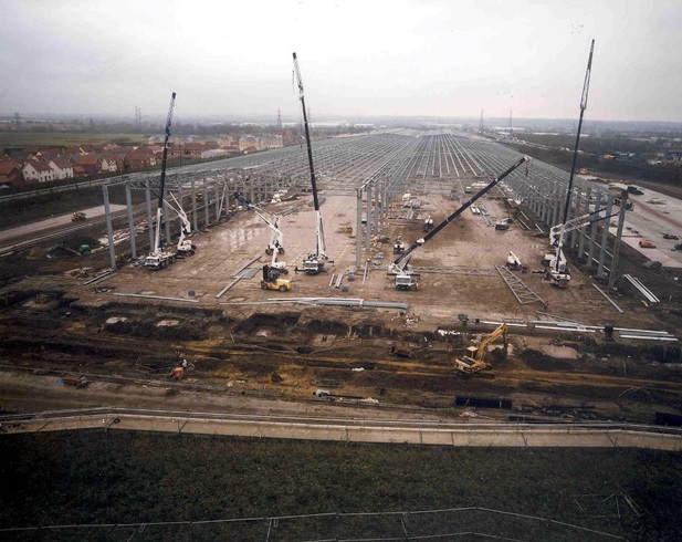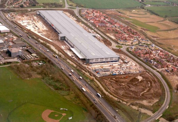 Construction of a 600m by 100m double truss steel construction distribution warehouse for Sainsbury’s. Works include major earthworks cut and fill grading, Soil stabilisation of 20 hectares, CFA piling, contiguous piled retaining wall, Gabion retaining wall, reinforced earth retaining wall, structural steel frame, roof and wall cladding, drainage works, underground services, fibre reinforced internal concrete slabs, air entrained external concrete slabs and pre-cast concrete dock levellers.